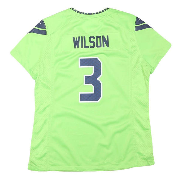 This vibrant green Nike womens T-shirt features the number 3 printed boldly on the front and back, with 'WILSON' named across the upper back. The shirt is made from a polyester blend fabric that offers durability and a lightweight feel, ideal for active wear or casual styling. The sleeve and shoulder areas include navy blue decorative elements with visible Nike swoosh logos.