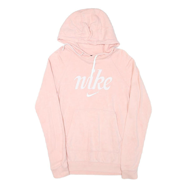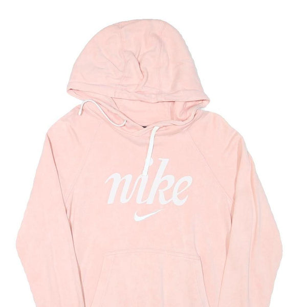 This Nike womens hoodie features a soft pink colour with a white Nike script logo prominently printed on the front. The hoodie has a relaxed fit with long raglan sleeves and a drawstring-adjustable hood for versatile comfort and style. A kangaroo pocket at the front offers practical storage.
