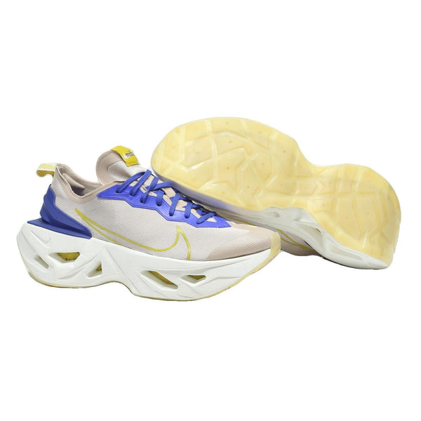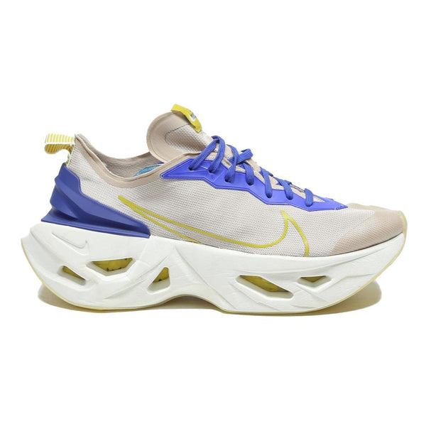 These Nike Zoom X Vista Grind trainers feature a striking cream mesh upper with vibrant blue overlays on the lace area and heel counter, complemented by a subtle yellow outline of the iconic Swoosh logo on the sides. The chunky white outsole with prominent cut-outs provides excellent cushioning and a distinctive futuristic look.