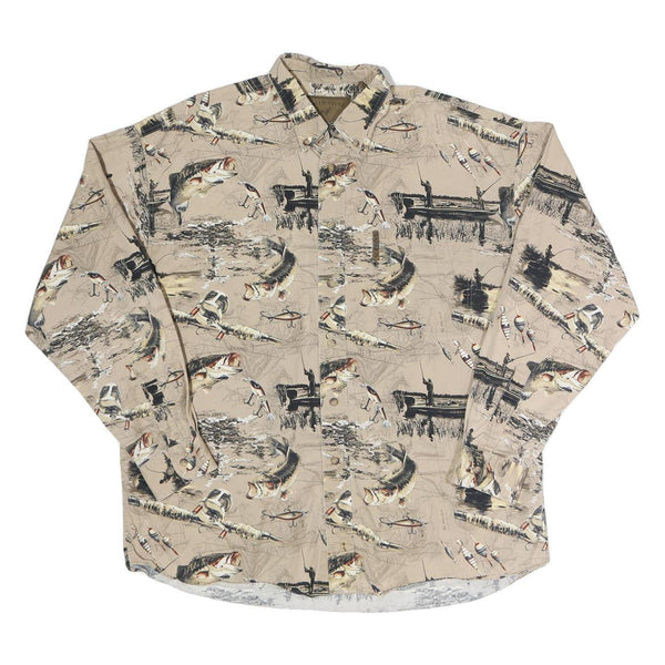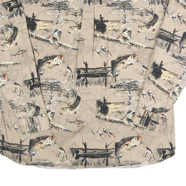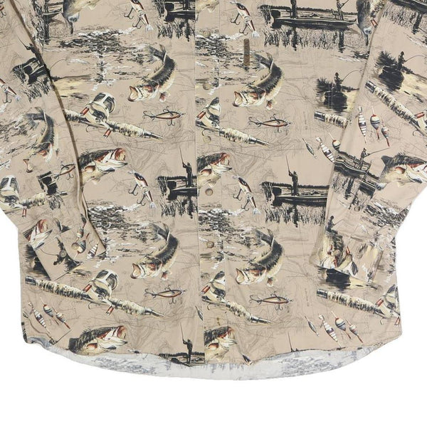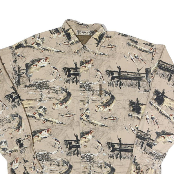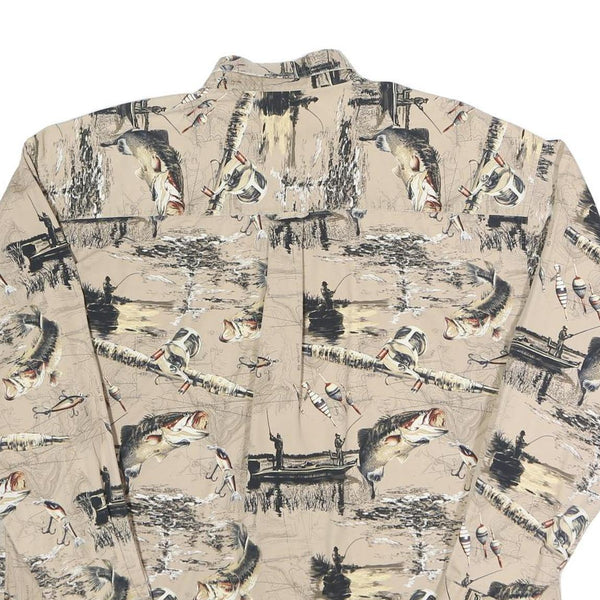 NORTH RIVER Mens Beige Fishing Print Cotton Shirt L Outdoor Angling Pattern