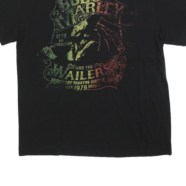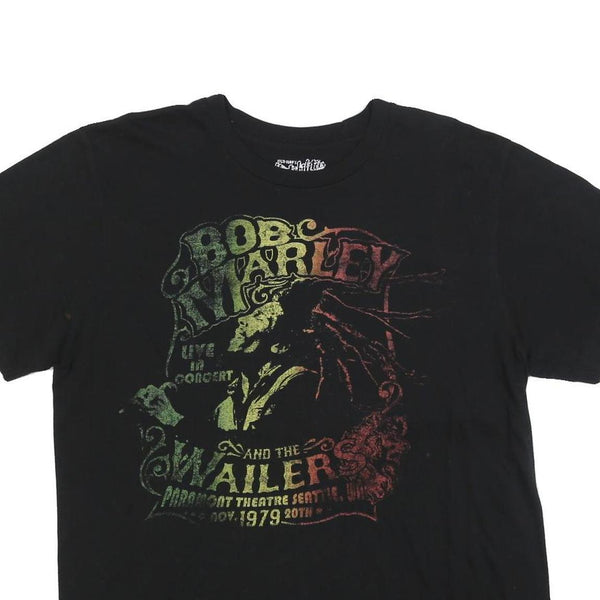 This Old Navy mens T-shirt features a black cotton blend fabric with a graphic print of Bob Marley and the Wailers in classic red, yellow, and green tones on the front. The text reads 'Bob Marley Live In Concert and The Wailers Paramount Theatre Seattle Nov. 20th 1979', giving the shirt a vintage-inspired concert tee look.