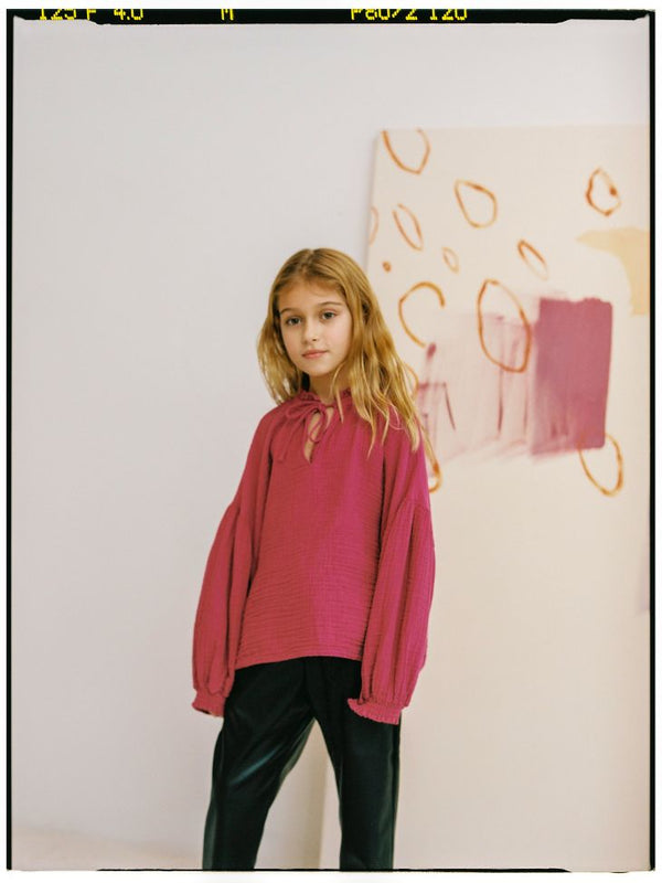 The Classic Olivia blouse for girls - being the best seller from The New Society - is back in an up-to-date reinterpretation. With an ample fit, it's a light garment full of movement. It is made with organic cotton chiffon with a tie-dye print in burgundy.