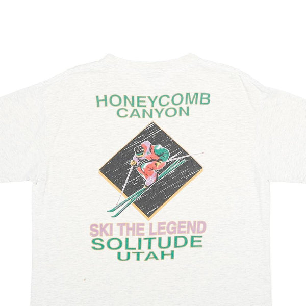 This Oneita mens T-shirt is crafted from soft cotton in a white shade. It features a small printed graphic on the front left chest with the text 'SKI THE LEGEND' and 'Solitude' alongside a green bird silhouette. On the back, the shirt showcases a large distressed graphic of a skier with 'HONEYCOMB CANYON', 'SKI THE LEGEND', 'SOLITUDE', and 'UTAH' text in green and pink hues.
