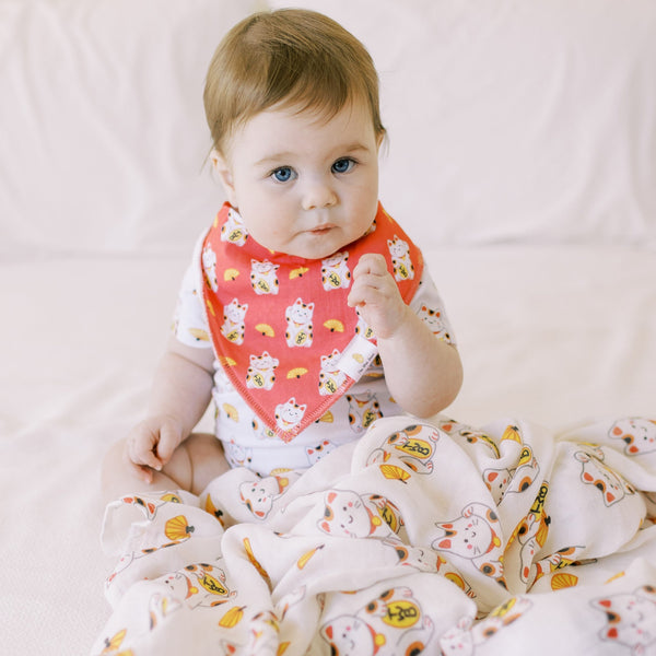 The Maneki Neko ("beckoning cat") is a common Japanese figurine believed to bring good fortune to its owners with its raised paw waving in good vibes. The original white color is for good luck and overall good fortune, while red is for good health. Now you can pass this good fortune to your little one, friends and family!