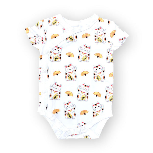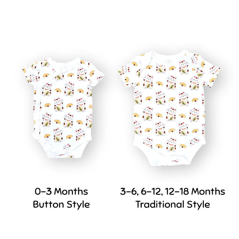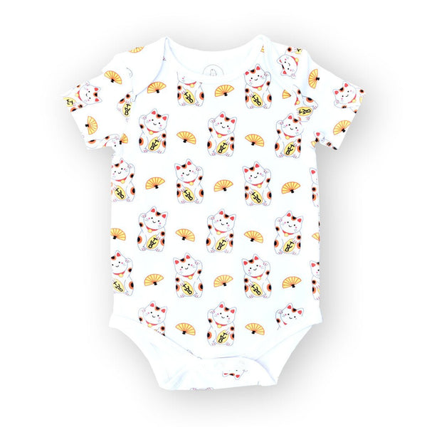 The Maneki Neko ("beckoning cat") is a common Japanese figurine believed to bring good fortune to its owners with its raised paw waving in good vibes. The original white color is for good luck and overall good fortune, while red is for good health. Now you can pass this good fortune to your little one, friends, and family! The chemicals and dyes used by many clothing manufacturers can irritate your baby's delicate skin. To combat this issue, we ensure that the texture of our fabric is as smooth and gentle as it can possibly be against your baby's sensitive skin.