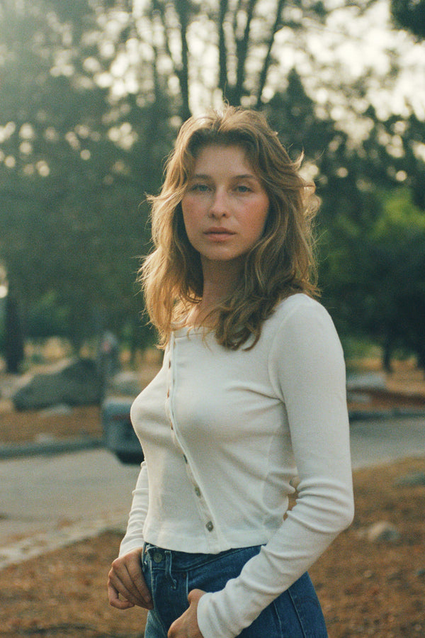 This off-kilter top features a slightly cropped button front fit finished with delicate neck binding and square river shell buttons. Made of organic baby rib fabric. Shrunken fit.