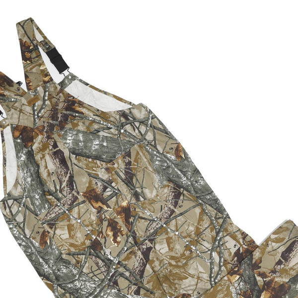 These OUTFITTERS EDGE dungarees feature a predominantly beige and brown camouflage pattern with natural tones resembling tree bark and autumn leaves. The print is distinctive and suitable for outdoor or casual wear. The garment includes practical front pockets and adjustable black buckled straps with white interior lining visible at the top.
