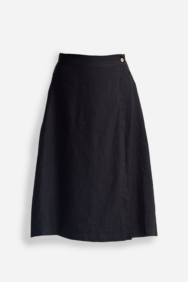 A welcome addition to your black wardrobe, this solid midi skirt with an overlap style and button detailing on the side lays out a versatile canvas for endless styling options. The skirt is crafted from 100% Hemp making it super comfy and breathable.