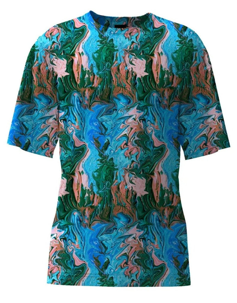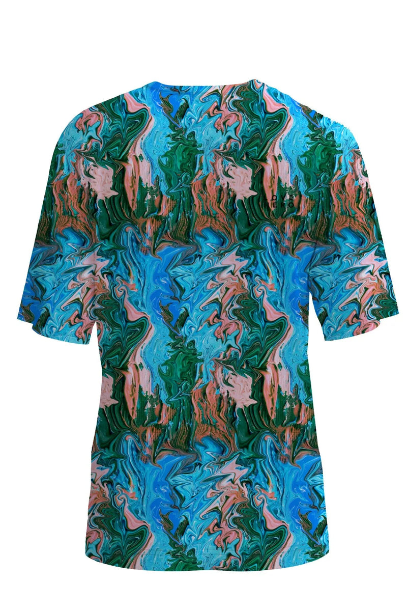 The cut is a classic fit with an all over repeat print which all started from a paint brush and a canvas. This can be styled up like we have done, pushing the print on print vibe, but you can also style this with a darker colour on top like a jacket. This will tone it down with a flash of these swirls of digital paint.