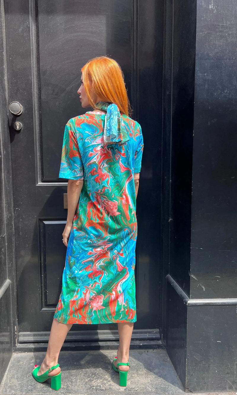 A stunning Printed T-shirt dress from our Second Layer Collection! Focusing on our core values, this piece is sustainable as it is stylish. The multicoloured paint swirls are inspired by artistic notions of layering paint over an existing painting on a canvas.