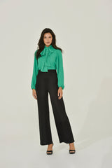 This runway-ready silhouette is Made in the USA from 61% Bamboo Rayon, 31% Recycled Polyester, and 8% Spandex. Pair Intention's sophisticated palazzo pants with our long-sleeve mandarin blouse and heels for a no-fuss glamorous look.