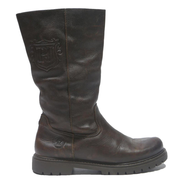 These Panama Jack boots are crafted from rich brown leather that exhibits a natural grain texture, offering both style and durability. The boots feature the embossed "PJ" shield logo on the upper shaft and a round logo near the heel for subtle branding.