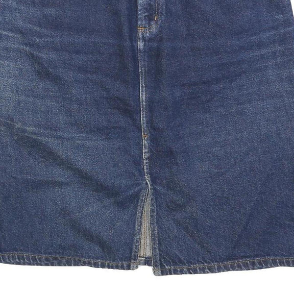 This womens Paris Blues skirt features a classic blue denim look with a midi length cut, combining timeless style with practical design. The skirt has a front button and zip closure, belt loops, and two functional back pockets with distinctive stitching. The rich indigo-blue colour offers a versatile and casual aesthetic.