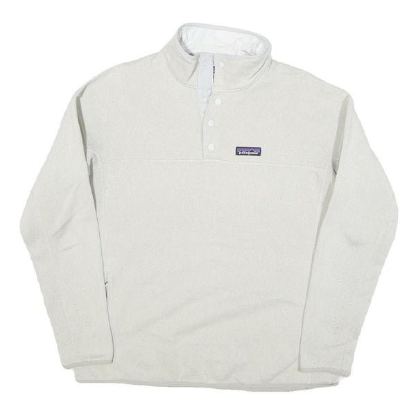 This Patagonia jumper for womens is crafted in a soft white polyester blend with a subtle textured finish. The pullover features a clean, plain design with the small, iconic Patagonia logo patch on the chest, lending understated brand authenticity.
