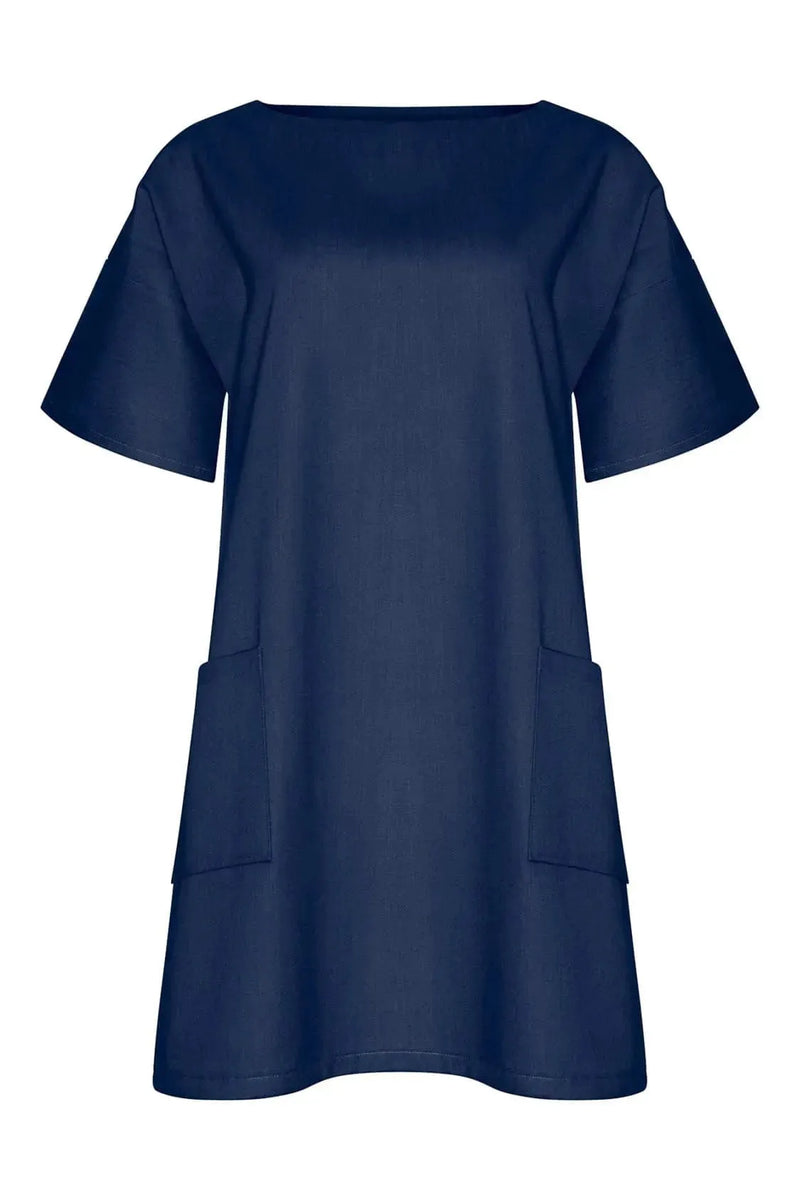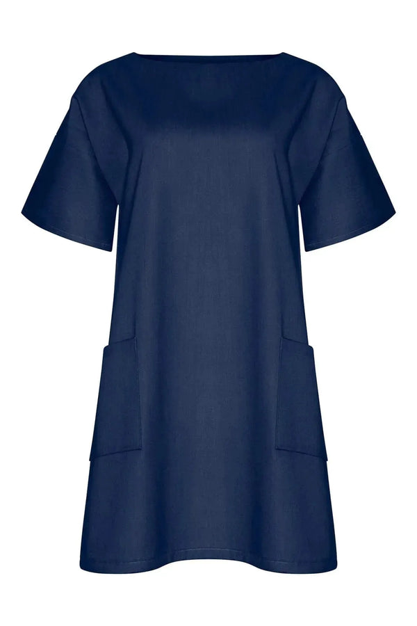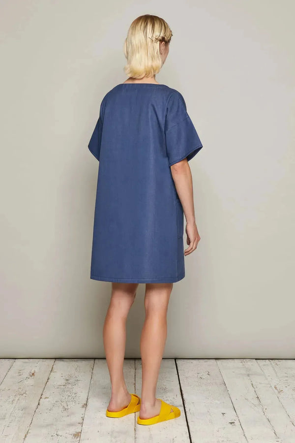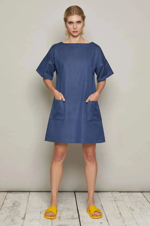 The Paula dress has a flared A-line silhouette and boat neck. The relaxed fit makes it a comfortable, yet elegant piece for any occasion. Made in England from super soft, 100% organic denim and features two oversize patch pockets to the front.