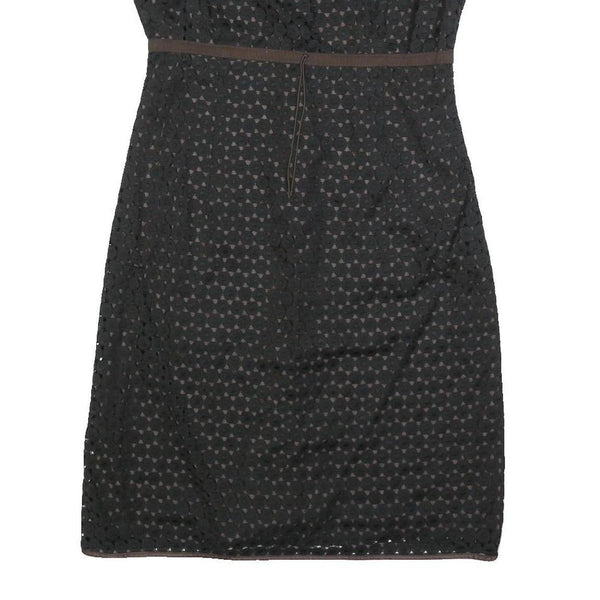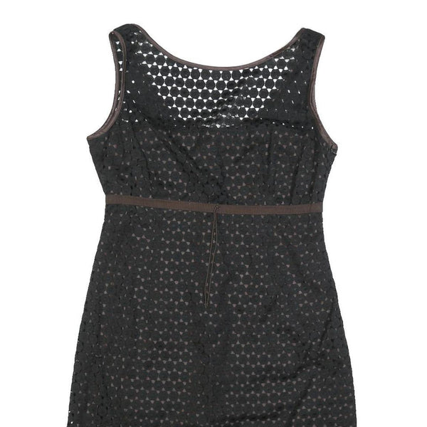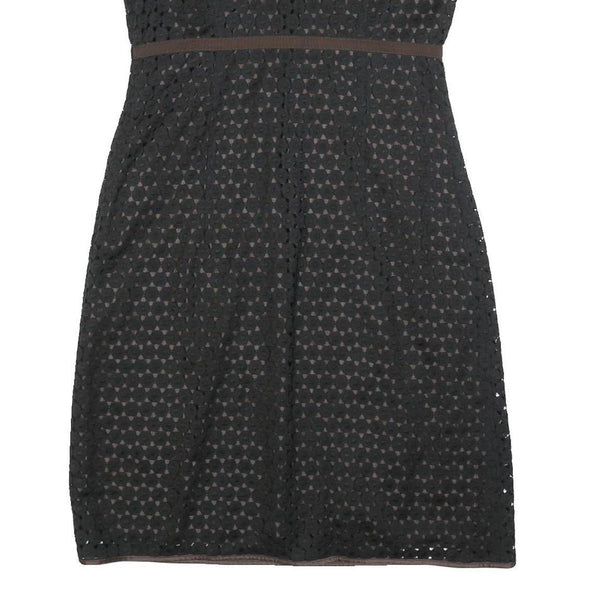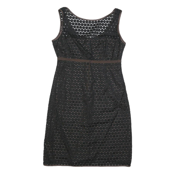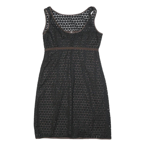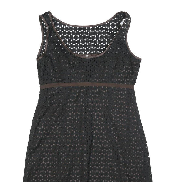 This Paule Ka womens dress features a black outer layer with a subtle brown undertone visible through the patterned cutouts. The sleeveless design is complemented by brown trim along the neckline, armholes, and waistline, creating a flattering silhouette. The dress is knee length, falling just above the knee for a versatile and chic look suitable for casual or semi-formal occasions.