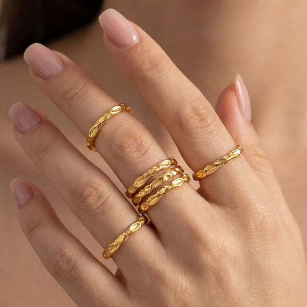 Petra Gold Stacking Ring is fully adjustable and is hand finished with a stone like texture. Wear it stacked together in multiples or mix with our other Amadeus stacking ring combinations.