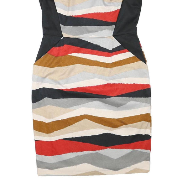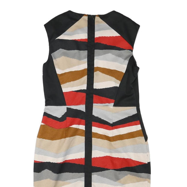 This PHASE EIGHT womens dress features a distinctive multicolour chevron pattern in shades of red, black, mustard, beige, and grey contrasted with solid black side panels. The sleeveless design and fitted waist create a flattering silhouette that complements the structured knee-length cut. A full-length back zip closure ensures easy wear.