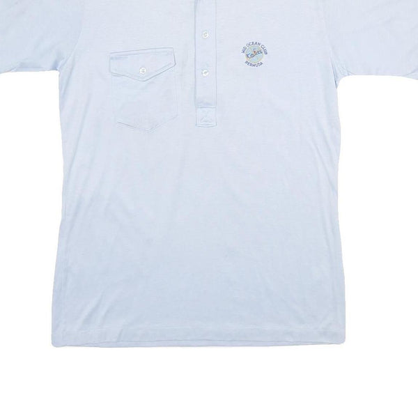 This Pickering Mens polo shirt features a soft light blue colour with a single button pocket on the left chest. It has a classic pointed collar and short sleeves, creating a timeless and versatile look. The front also displays a neat embroidered crest with the text "Mid Ocean Club Bermuda" and a crossed oars motif, adding a subtle nautical theme.