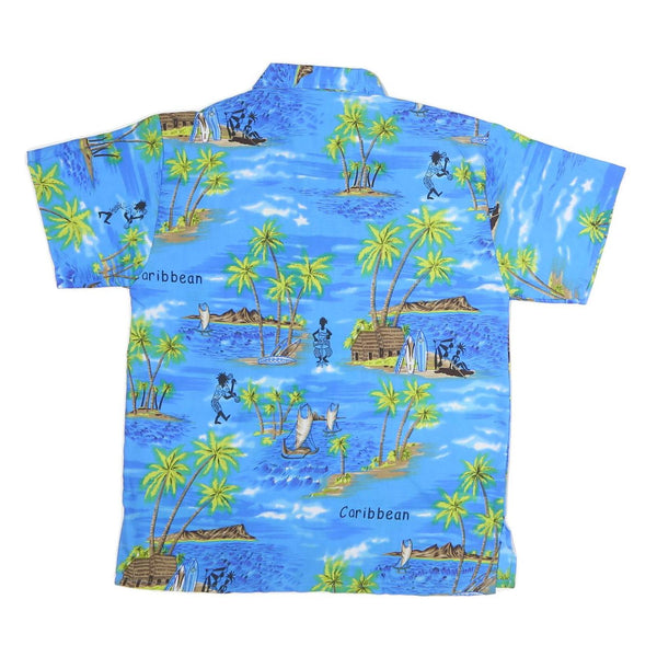 This PINA mens shirt features a vibrant blue base with a detailed Caribbean-inspired print showcasing palm trees, huts, sailboats, and silhouettes of people playing drums, set against a tropical sea background. The short sleeves and button-up style highlight its casual holiday appeal.