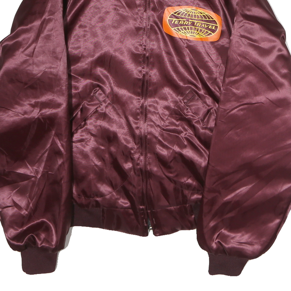 This mens PLA JAC bomber jacket features a deep maroon colour with a sleek satin finish that gives it a smooth, shiny appearance. The front chest displays a distinctive orange and yellow 'Terry Travel' logo with a globe design, adding a vintage travel motif to the jacket's style.
