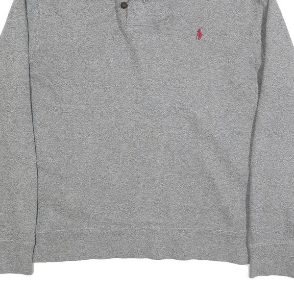 This Polo Ralph Lauren mens sweatshirt features a soft grey cotton blend fabric with a subtle heather texture. It has a distinctive shawl collar with a double-button fastening on the front for an elevated and cosy look. The iconic Polo Ralph Lauren pony logo is embroidered in red on the left chest, adding classic brand recognition.