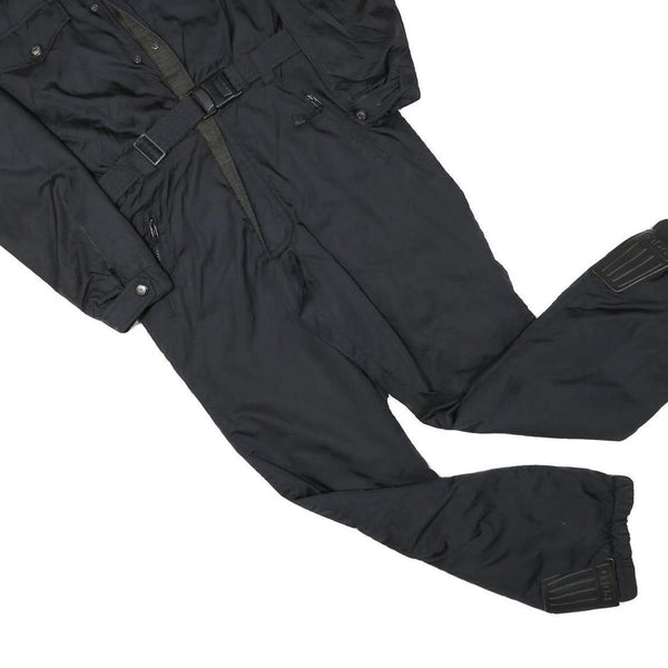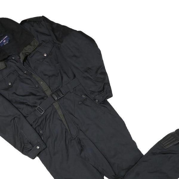 These Polo Sport Ralph Lauren womens dungarees are crafted in a sleek black polyester blend, providing a smooth and durable finish. The design features a structured collar and buttoned cuffs, with flap chest pockets for added practicality and style. The legs taper neatly to elasticated ankle hems with reinforced pads, perfect for a comfortable and secure fit.