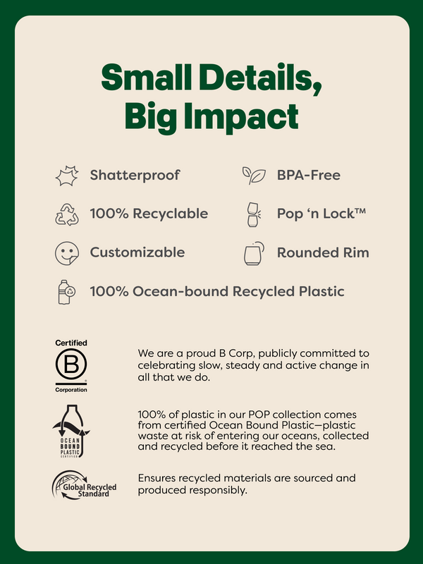 When the thirst is real, and more is more. This is the one you grab when you're pouring a cold one, a tall one, a large one, or a double-double anything you can gulp down and say, “Ahhh” afterwards. Made with up to one post-consumer bottle per cup and is ♻️ #1 (curbside recyclable).