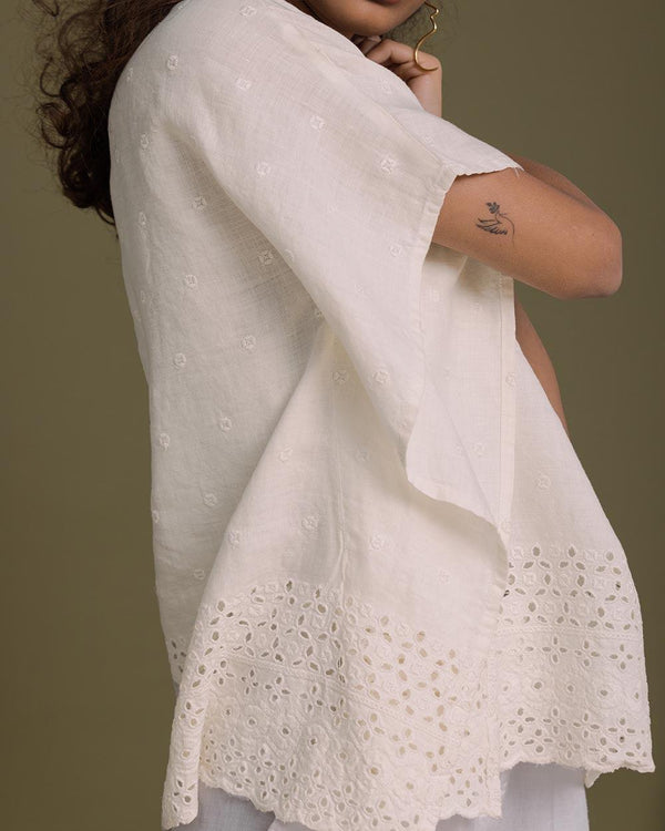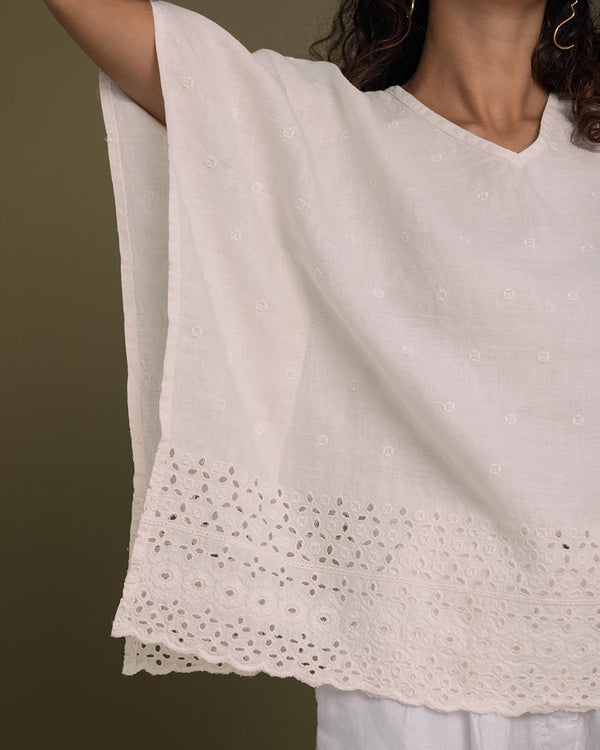 With intricate and elegant eyelet embroidery, this V-neck top features kaftan-style sleeves for a relaxed and fashionable fit.
