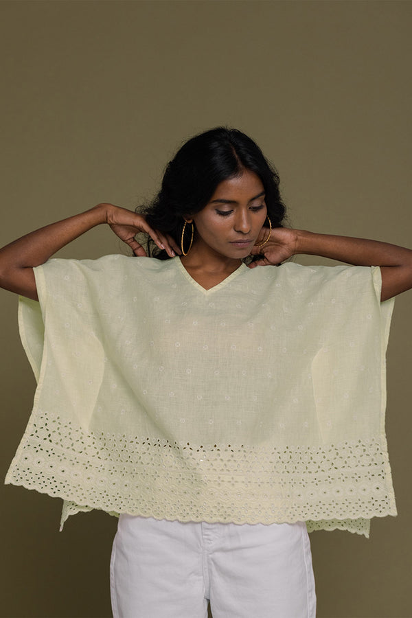 With intricate and elegant eyelet embroidery, this V-neck top features kaftan-style sleeves for a relaxed and fashionable fit.
