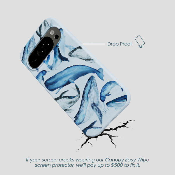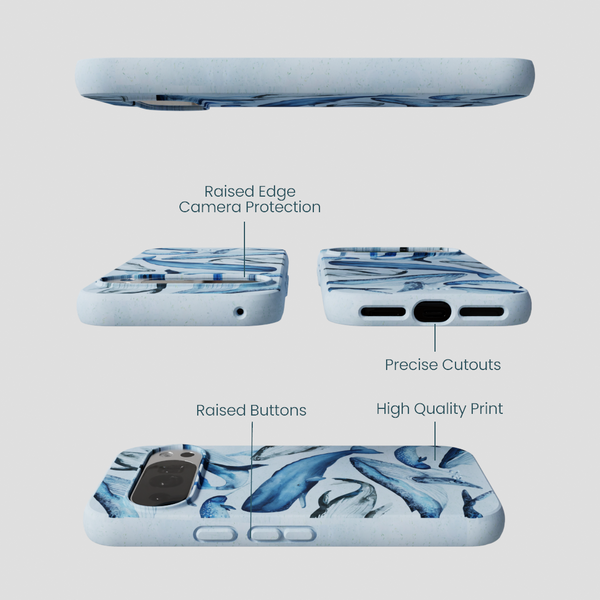 Dive into the depths of the ocean with the Whales Phone Case! This enchanting design showcases a variety of majestic whales swimming gracefully across a soothing powder blue background. Each whale is beautifully illustrated, capturing their serene and awe-inspiring presence. Perfect for marine life enthusiasts and ocean lovers, this case adds a splash of aquatic charm to your device while providing sturdy protection. Make a splash and let the gentle giants of the sea accompany you on all your adventures with the Whales Phone Case!