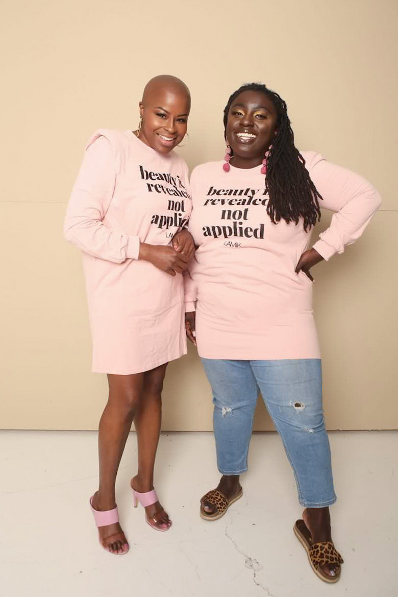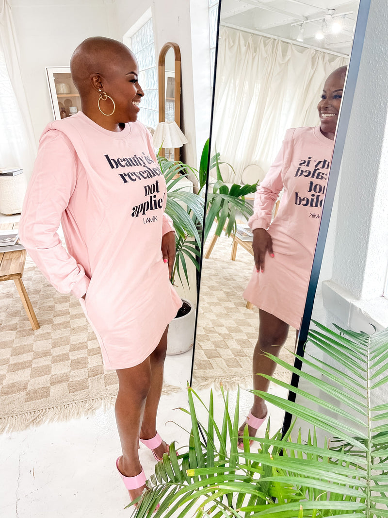 But this dress is more than just a fashion statement. It features LAMIK Beauty's company motto, "Beauty is revealed not applied," reminding you that true beauty comes from within. This message is a powerful reminder to embrace your natural beauty and let it shine through