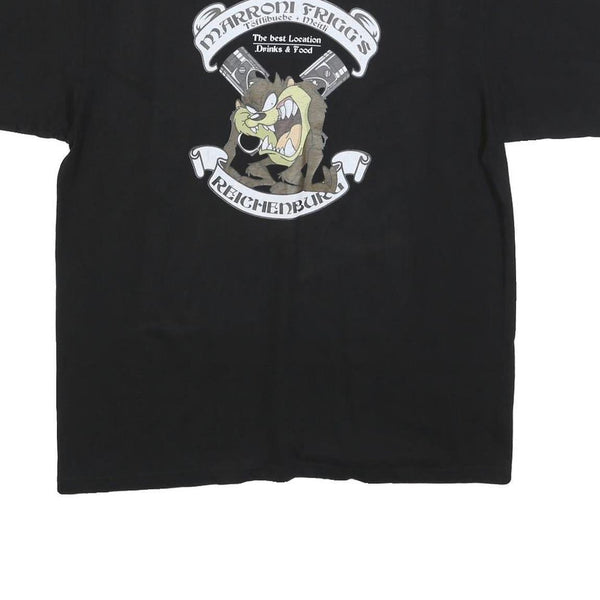 This Promo Doro mens T-Shirt is crafted from a comfortable cotton blend fabric in solid black. The front features a small graphic print on the chest, while the back displays a bold cartoon design with text that reads "Marroni Frigg's Reichenburg" and "The best Location Drinks & Food." The striking cartoon character and thematic text add a playful and graphic edge to the tee.