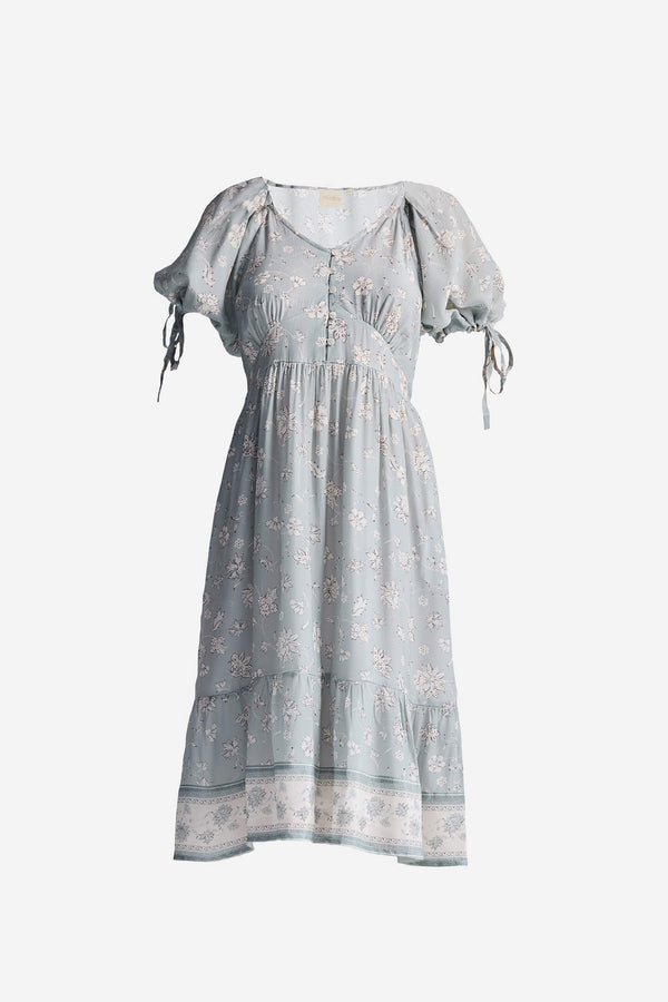 Dramatic sleeves and a fitted bodice make this midi dress one you can’t miss. This pretty dress is perfect for casual sunny days out in the park or brunching with your girls. The tiers, puff sleeves, the contemporary print, ruffled hem and bow ties come together beautifully to make it an effortless and versatile outfit that can be dressed up or down!