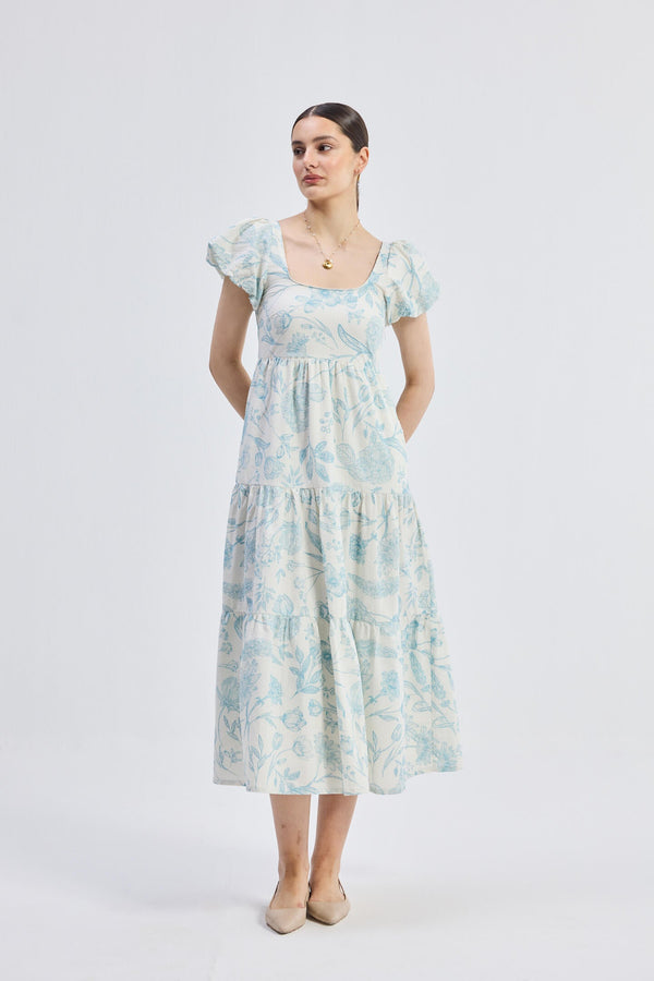 Here’s your dreamy floral maxi dress layered with delicate tiers. The flowing, eco-friendly silhouette and tiered design and elasticated back offer a flattering fit and comfortable wear. Its chic puff sleeves and back tie add a touch of drama to this effortlessly stylish and comfy outfit.