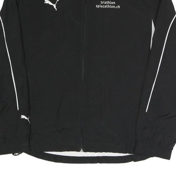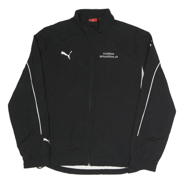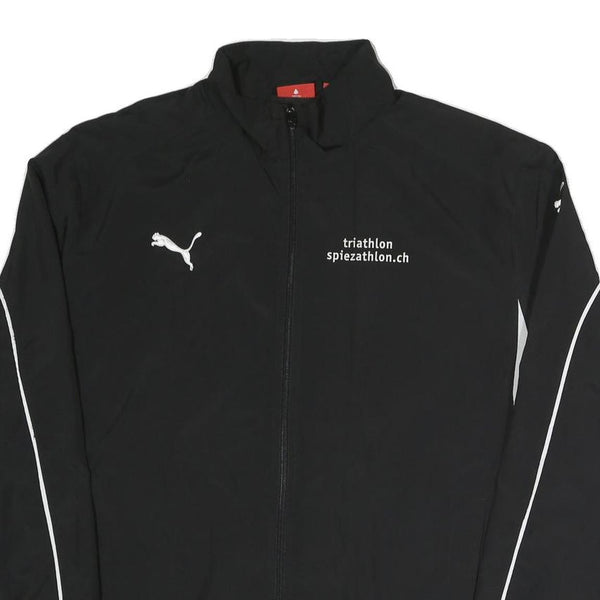 This Puma mens jacket features a sleek black design with white accents on the back and sleeves. The front sports the Puma logo and a printed 'triathlon spiezathlon.ch' text, adding a sporty touch. It has a full-length zip closure and a stand-up collar.