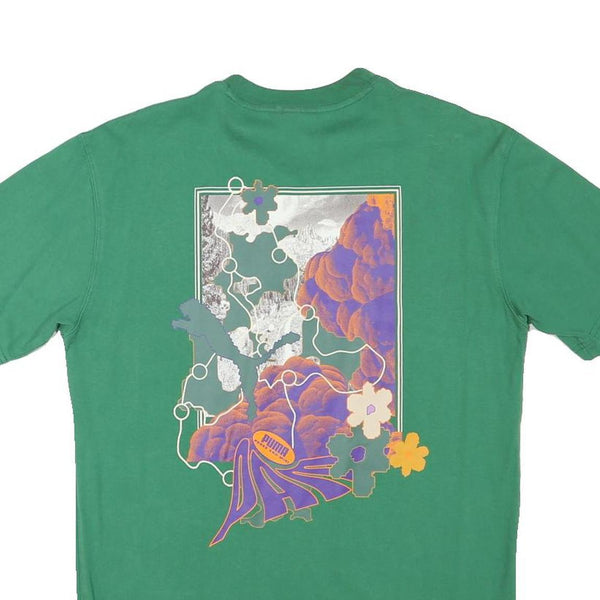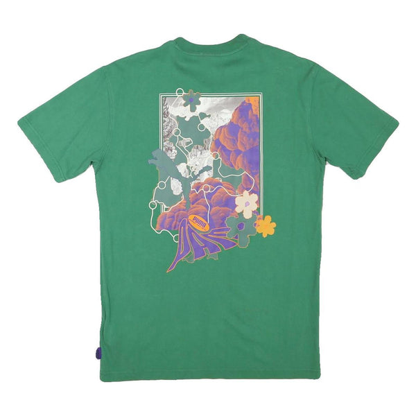 This Mens green T-shirt by PUMA features a distinctive and colourful graphic print on the back showing an abstract map design with floral elements in purple, yellow and grey. A smaller matching graphic detail is on the front chest. The PUMA logo is incorporated in the design, reflecting Puma's sporty and stylish branding.