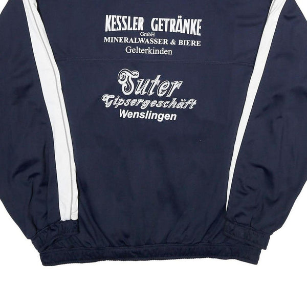 This mens PUMA track jacket features a classic navy blue base complemented by white stripes running along the shoulders and sleeves. The front proudly displays the PUMA logo on the right chest and an embroidered football club text logo on the left chest, adding sporty visual interest. The rear showcases white advertising text graphics for Kessler Getranke and Suter Tipsergeschaft, giving the jacket a distinctive vintage sports aesthetic.