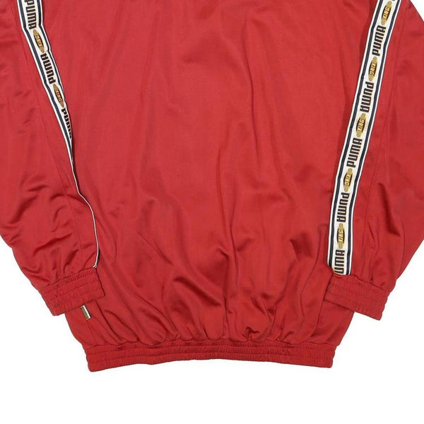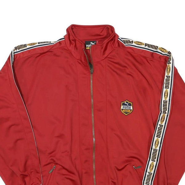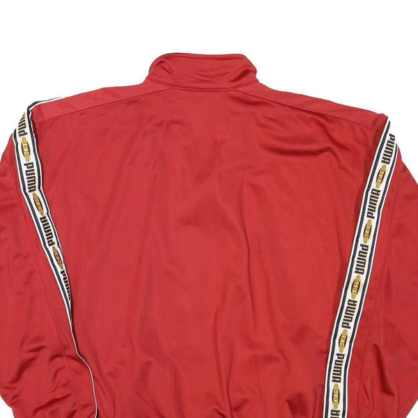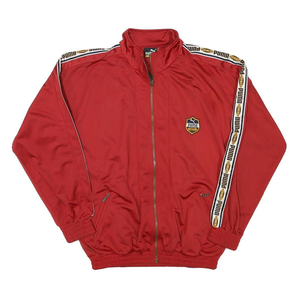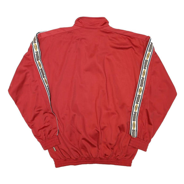 This mens track jacket from PUMA features a bold red colour with branded tape detailing running along both sleeves displaying the 'PUMA' logo and crown design in black and gold. A small PUMA crest patch is embroidered on the chest, adding an authentic branded detail.