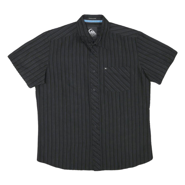 This Quicksilver Mens shirt features an elegant black base adorned with thin grey vertical stripes creating a refined striped pattern throughout. The shirt has a neat button-down front and a single chest pocket, which includes a small Quicksilver logo tab, adding subtle branding to the design. It also includes a classic point collar and short sleeves, making it suitable for warmer weather.