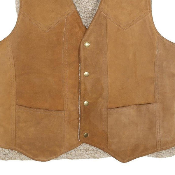 Made from genuine leather, the jacket feels supple and durable with a smooth suede finish. The fit is regular and sleeveless, making it perfect as a layering piece. The neutral beige colour lends it a vintage western aesthetic suitable for casual wear.