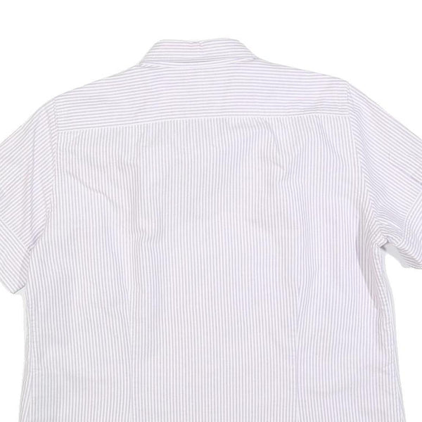 Made from soft, breathable cotton, this short-sleeve shirt is comfortable for warm weather and casual wear. It fits a size L and offers a relaxed yet tailored silhouette with a slightly curved hem for stylish layering or single wear. The crisp stripe pattern lends a timeless appeal suitable for various casual or semi-formal occasions.