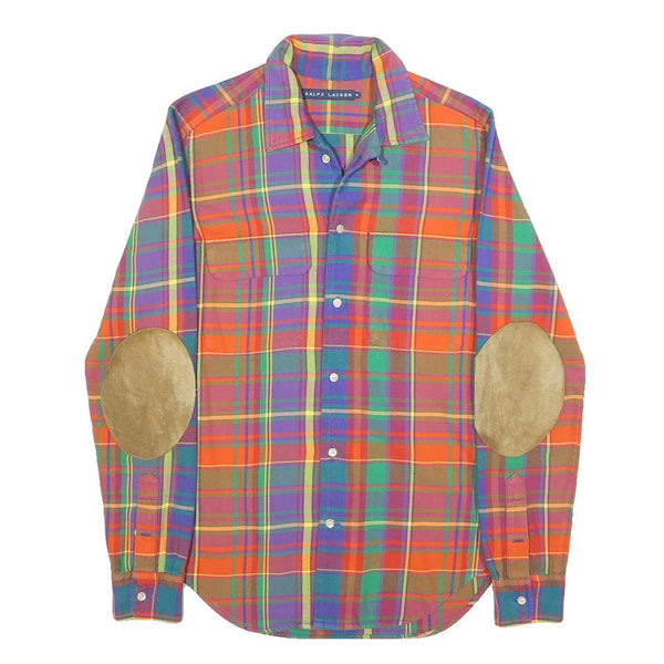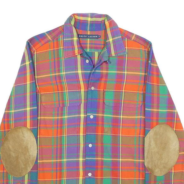 This Ralph Lauren womens shirt features a vibrant plaid pattern combining bold orange, purple, green, and yellow hues for a striking look. The front is detailed with button closure and two chest pockets, while tan suede elbow patches add a distinct classic touch.