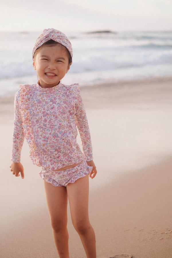 The girl's turban in padma flower print is lightweight, stylish, and has SF50 protection. It's ideal for the forgetful ones who never remember their sun creams like us. Made from recycled material, it protects the planet and allows free body movements. Perfect to wear while swimming or building sun castles. Get matching swim set for the full look, click here.