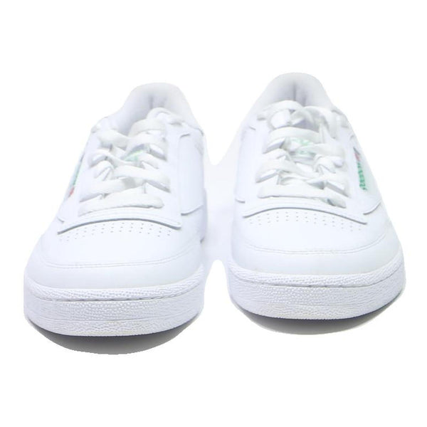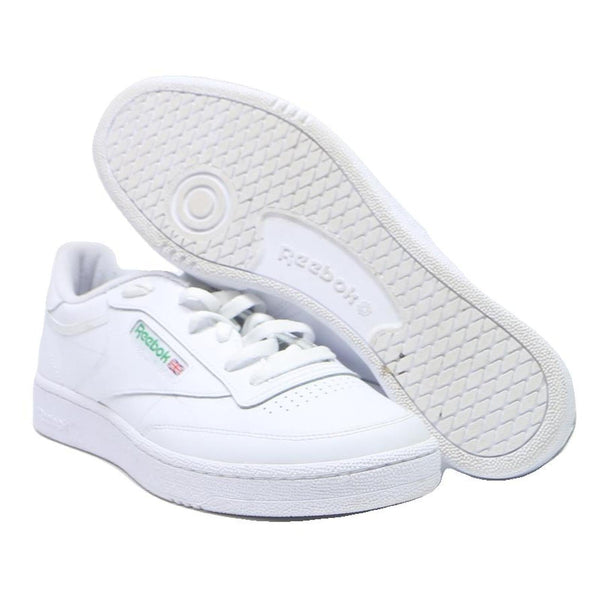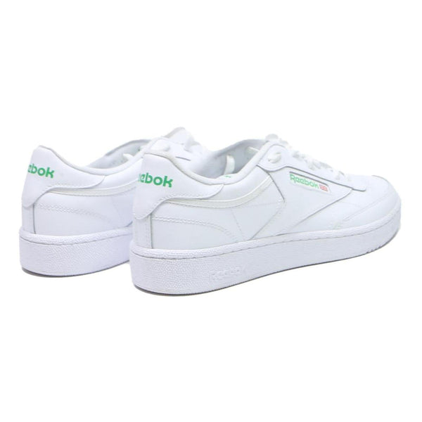 These Reebok Club C trainers for men showcase a clean white leather upper with subtle green Reebok branding on the side and heel. The design is minimalistic and timeless, featuring a perforated toe box and traditional lace-up closure for secure fit and breathability.