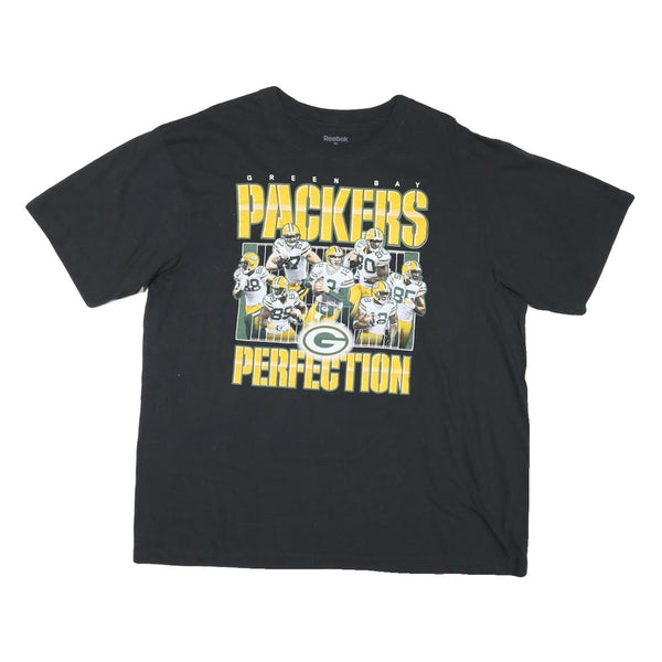 This men's Reebok T-shirt is crafted from a cotton blend, featuring a black base colour. The front boldly displays a vibrant graphic print of Green Bay Packers NFL players with large yellow text 'PACKERS PERFECTION' and the team's logo, making it a standout piece for fans.