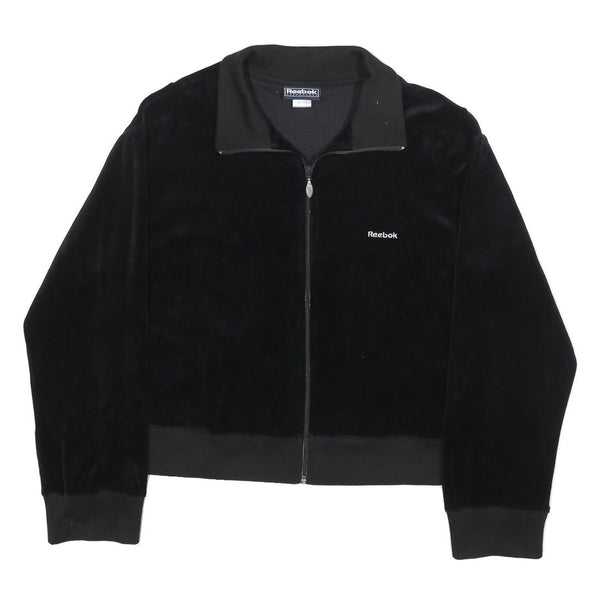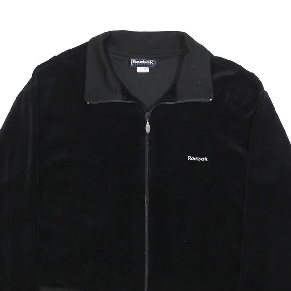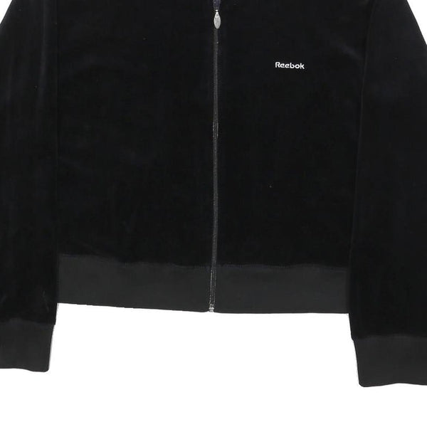 This womens Reebok jacket features a sleek black colour throughout its soft cotton blend fabric, providing a plush feel and comfortable wear. The front displays a small white embroidered Reebok logo on the left chest, adding subtle branding detail. The jacket has a simple, clean appearance with a plain pattern and no other embellishments.