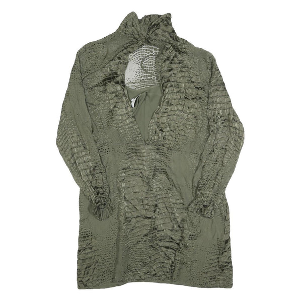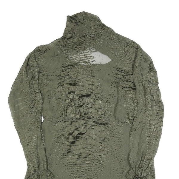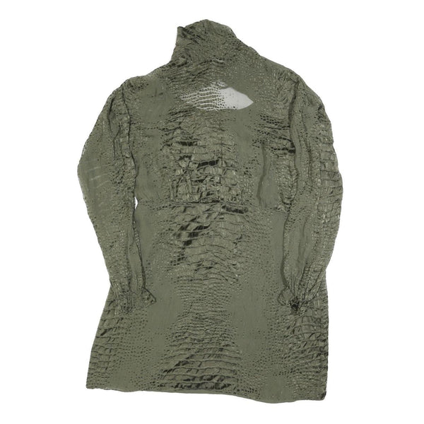 This womens dress from REISS features a distinctive green colour with a textured, almost reptile-skin inspired pattern across the fabric. The dress has a sophisticated, elegant look with subtle sheen and an interesting tactile surface.