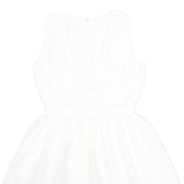This REISS womens dress is crafted in a clean white colour with a subtle textured stripe pattern throughout. It features a flattering fit and flare silhouette, sleeveless design, and a round neckline. The dress includes a concealed zip closure at the back for a smooth finish.