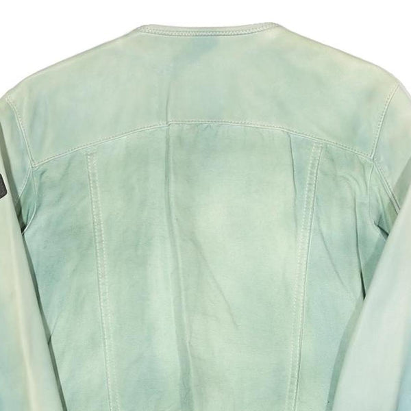 This womens REPLAY jacket is crafted from soft blue leather with a subtle gradient effect, giving it a unique and stylish look. It features a classic biker jacket design with an asymmetrical zip closure, snap button details, and zippered cuffs. The collar is a stand-up style, adding to the sleek appearance.